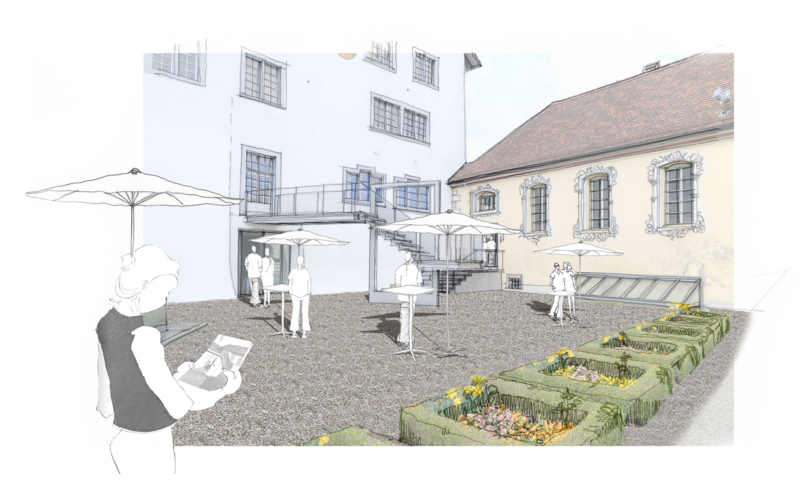 Es soll ein festlicher Raum werden; ein Raum, der den barocken Glanz spüren lässt. Ein Raum, der für sakrale Nutzungen die richtige Stimmung bieten kann. Ein Raum für Musik, Konzerte, Filmvorführungen, Vorträge, Podiumsdiskussionen. Ein Ort für Begegnungen, Ausstellungen, Jugendtreff. Es soll also ein Gefäss geschaffen werden, welches eine intensive Nutzung zulässt, entsprechend flexibel und multifunktional, aber auch neutral sein kann. Nicht Mehrzweckhalle, sondern ein Ort für verschiedene Stimmungen. Das Gebäude, der Raum ist barock. Wir erhalten und festigen die barocken Elemente. Wir erlauben uns, gewisse Lücken zu rekonstruieren, wo der Befund eindeutig ist. So kann z.B. eine beschädigte Stuckatur ergänzt werden, der Kalkputz wieder hergestellt werden (und damit die gotische Substanz geschützt werden). Der Raum wird wieder monochrom gefasst, vielleicht mit Nuancen von Spielen mit Farbtönen. Der Dielenboden bleibt erhalten, wird aber ergänzt, geflickt – vermutlich mit neuer Unterkonstruktion, damit er den verschiedenen Nutzungen gerecht wird. Nutzungsbedingte neue Eingriffe bleiben ablesbar, fügen sich lautlos ein und dominieren nicht. Sie übernehmen aber im übertragenen Sinne die barocke Sprache: feingliedrig, verspielt, anmutend. Eine neue gewölbte Decke wird wieder ein Dach über dem länglichen Raum bilden. Sie könnte aus einem lamellenartigen oder gerillten Material sein und dabei notwendige technische Funktionen übernehmen wie Akustik, Lüftung, Licht etc. Der neue Erker auf der Ostseite muss sorgfältig ausformuliert werden. Durch den indirekten Tageslichteinfallt stellt dieser eine Art Lichthof dar und öffnet in subtiler Form den ursprünglich introvertierten barocken Raum. Zusätzlich dient diese Raumerweiterung als kleine Bühne, gibt dem Raum eine klare Ausrichtung und die Rückwand bietetet eine spannende Wandfläche für Kunst am Bau.